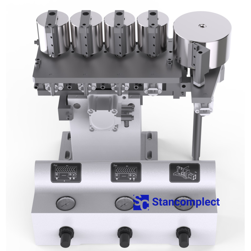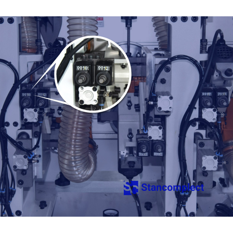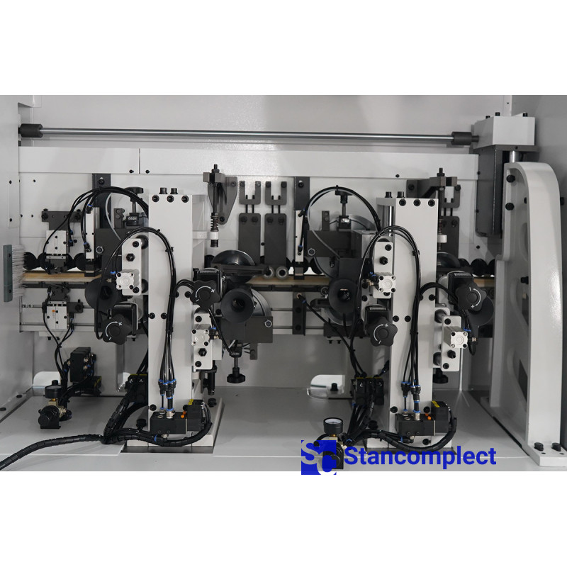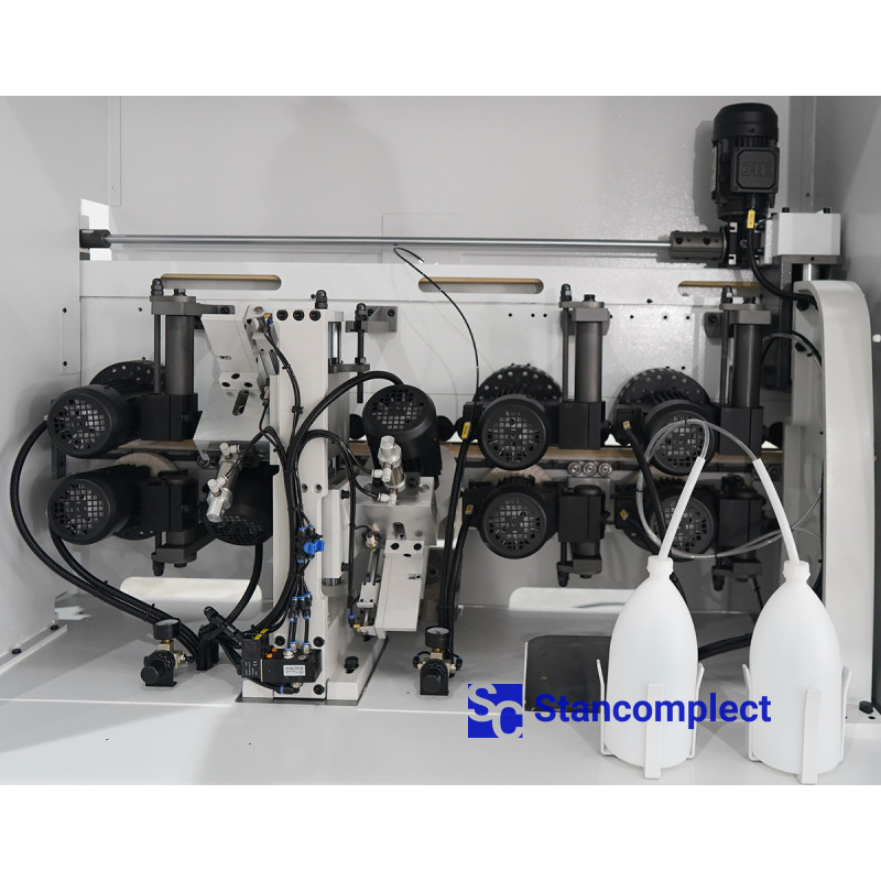 The pressure unit consists of 5 rollers with scrapers to remove excess glue and are driven by pneumatics, which guarantees uniform distribution of forces on the edge during gluing.