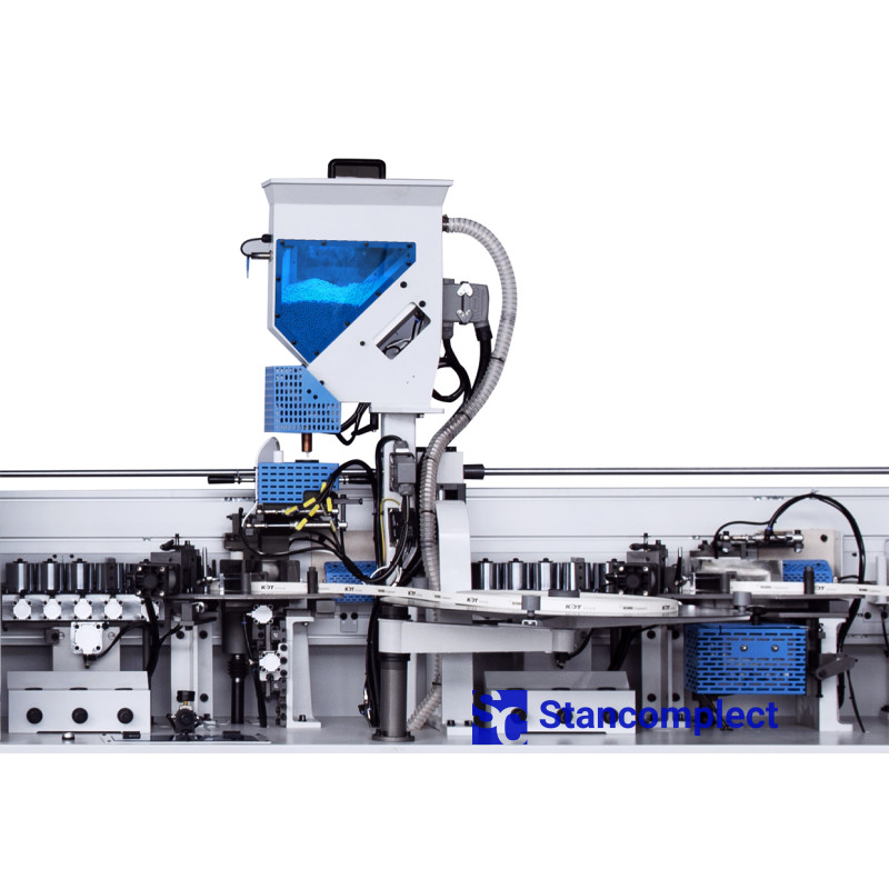 The machine is equipped with automatic pneumatic loading of granular glue. A large 12.5 kg hopper is installed at the bottom of the machine frame, from which, through an air flow, the granules are transported to the upper hopper with pre-melt.