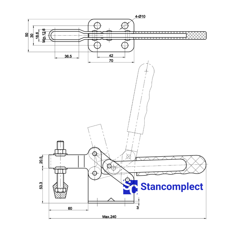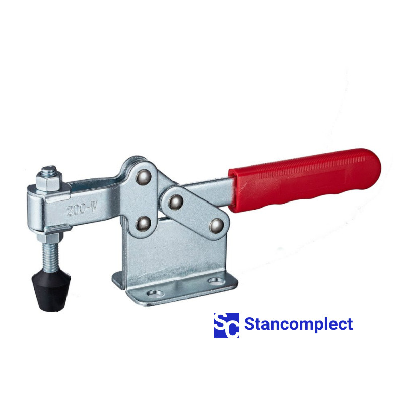 Toggle clamp ST-200-W with a horizontal handle for quick clamping of the workpiece. The clamping screw has a rubberized tip. The U-shaped bar allows you to adjust the position of the clamping screw. Quick release horizontal toggle clamp ST-200-W provides high productivity due to reliable and fast fixing of assemblies and parts with one hand movement.