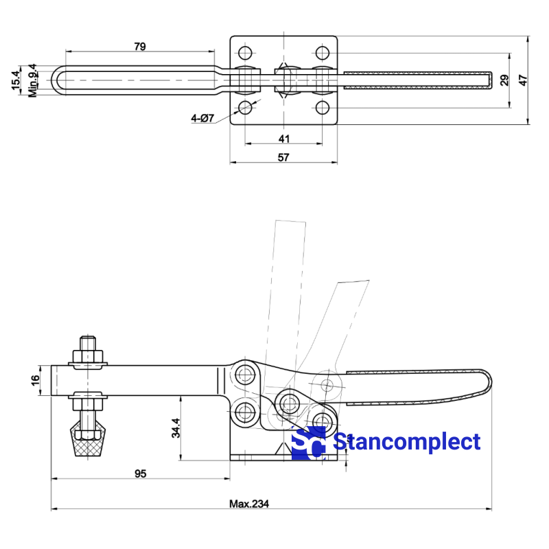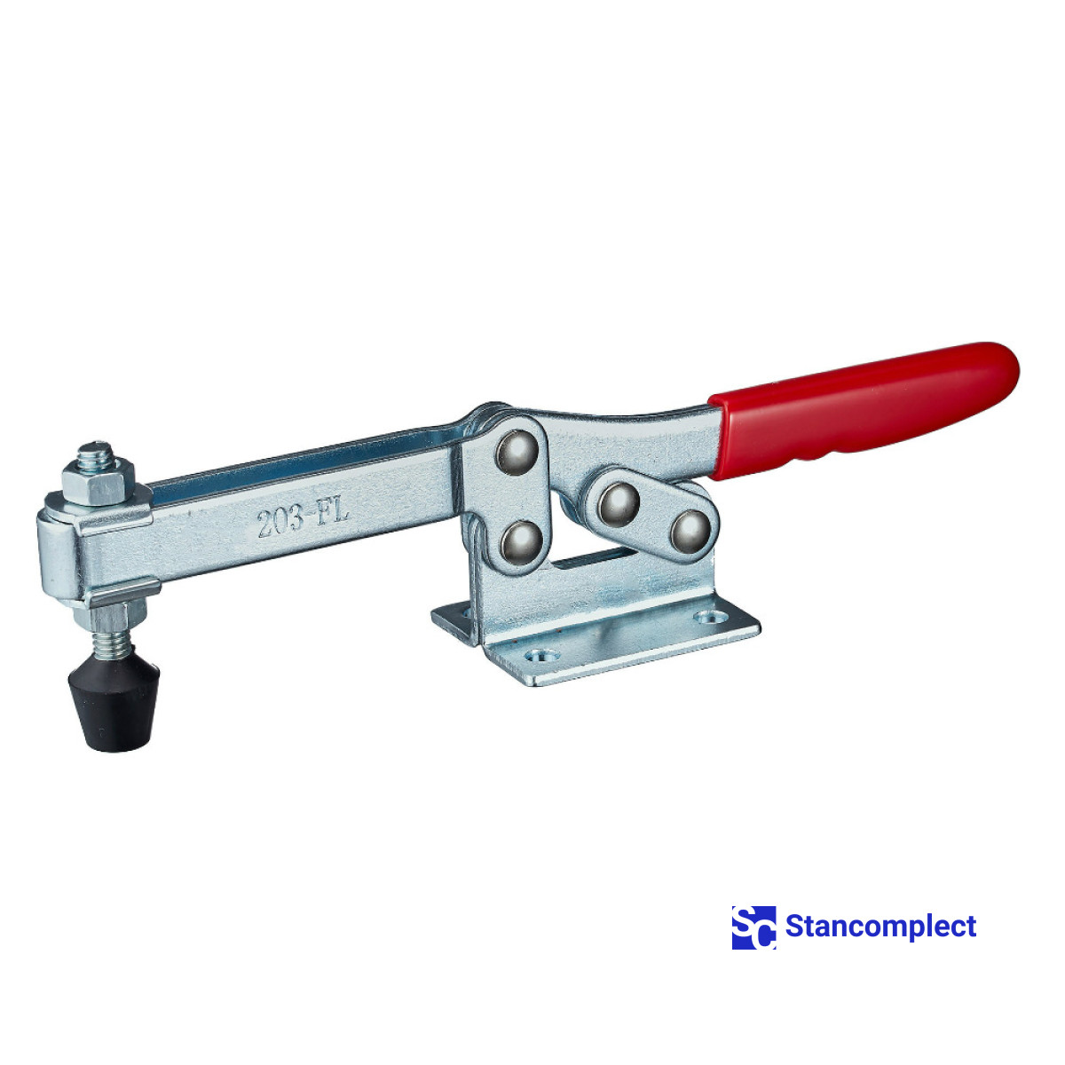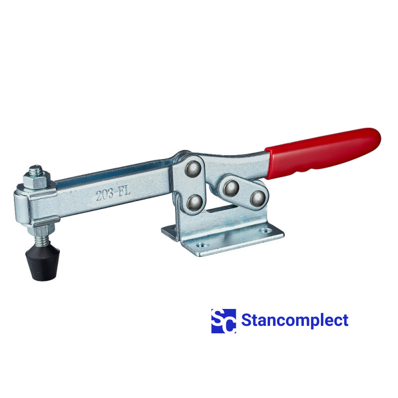 Toggle clamp ST-203-FL with a horizontal handle for quick clamping of the workpiece. The clamping screw has a rubberized tip. The U-shaped bar allows you to adjust the position of the clamping screw. Quick release horizontal toggle clamp ST-203-FL provides high performance by securely and quickly fixing assemblies and parts with one hand movement.