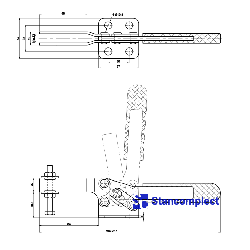 Toggle clamp ST-25382 with a horizontal handle for quick fixing of the workpiece. The U-shaped bar allows you to adjust the position of the clamping screw. Quick release horizontal toggle clamp ST-25382 provides high performance by securely and quickly fixing assemblies and parts with one hand movement.