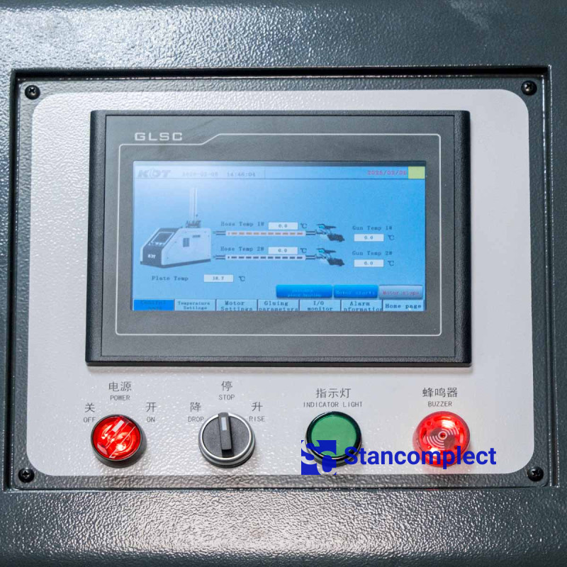 PUR Hot Melt Pre-Melter is equipped with a color touchscreen, physical buttons and knobs, a programmable logic controller, and inverter control. The control system doses the adhesive and monitors the temperature of the adhesive tank and hose, as well as operates the pneumatic cylinder. Settings vary depending on the adhesive type, workpiece material, and ambient temperature. Adhesive delivery can be performed in both manual and automatic modes.