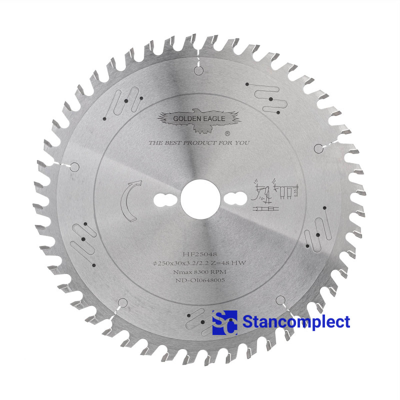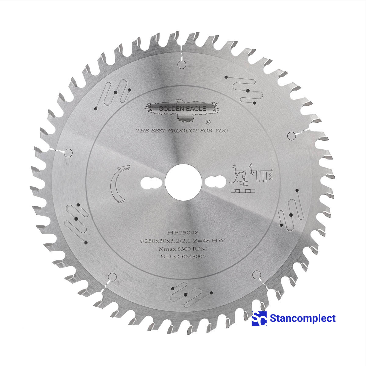 Main saw blade for cutting wood 250x30x3.2/2.2 Z48 for sliding table saws manufactured by the Taiwanese company GOLDEN EAGLE with carbide tips are designed for fine cutting chipboard, laminated chipboard, MDF, HDF, etc.. These saw blades have proven themselves in many furniture enterprises as a high-quality cutting tool.
