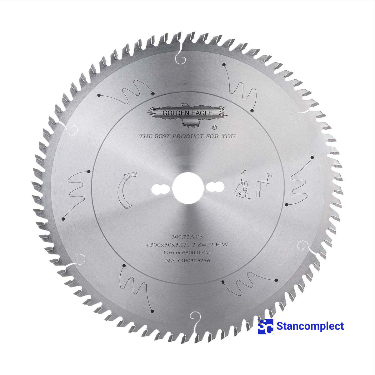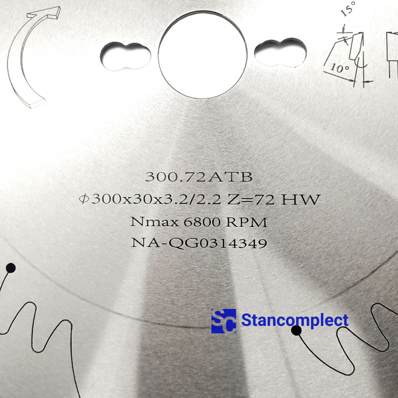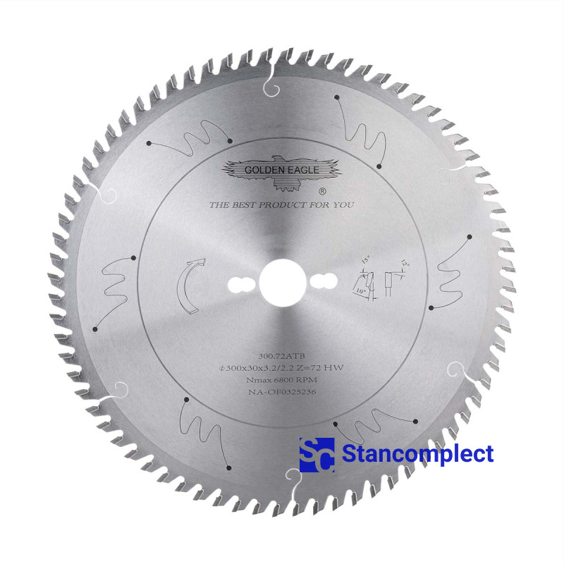 Main saw blade for cutting wood 300x30x3.2/2.2 Z72 for sliding table saws manufactured by the Taiwanese company GOLDEN EAGLE with carbide tips are designed for fine cutting chipboard, laminated chipboard, MDF, HDF, etc.. These saw blades have proven themselves in many furniture enterprises as a high-quality cutting tool.