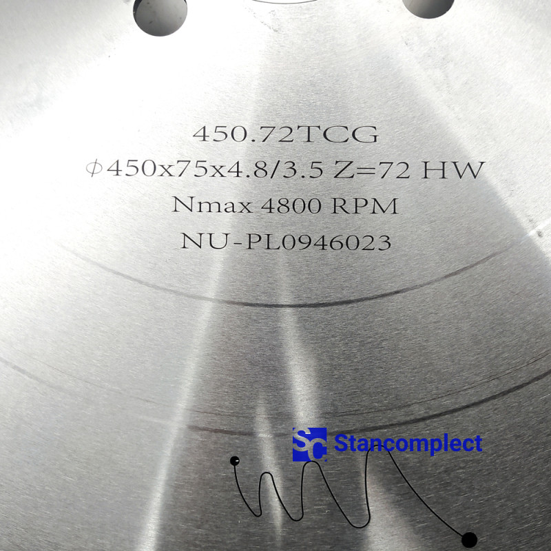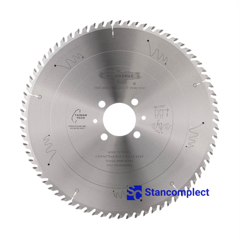 Carbide main saw blade 450x75x4.8/3.5 Z72 for CNC beam saws KDT manufactured by Taiwanese company GOLDEN EAGLE with carbide tips are designed for fine cutting chipboard, laminated chipboard, MDF, HDF, etc.. These saw blades have proven themselves in many furniture enterprises as a high-quality cutting tool.