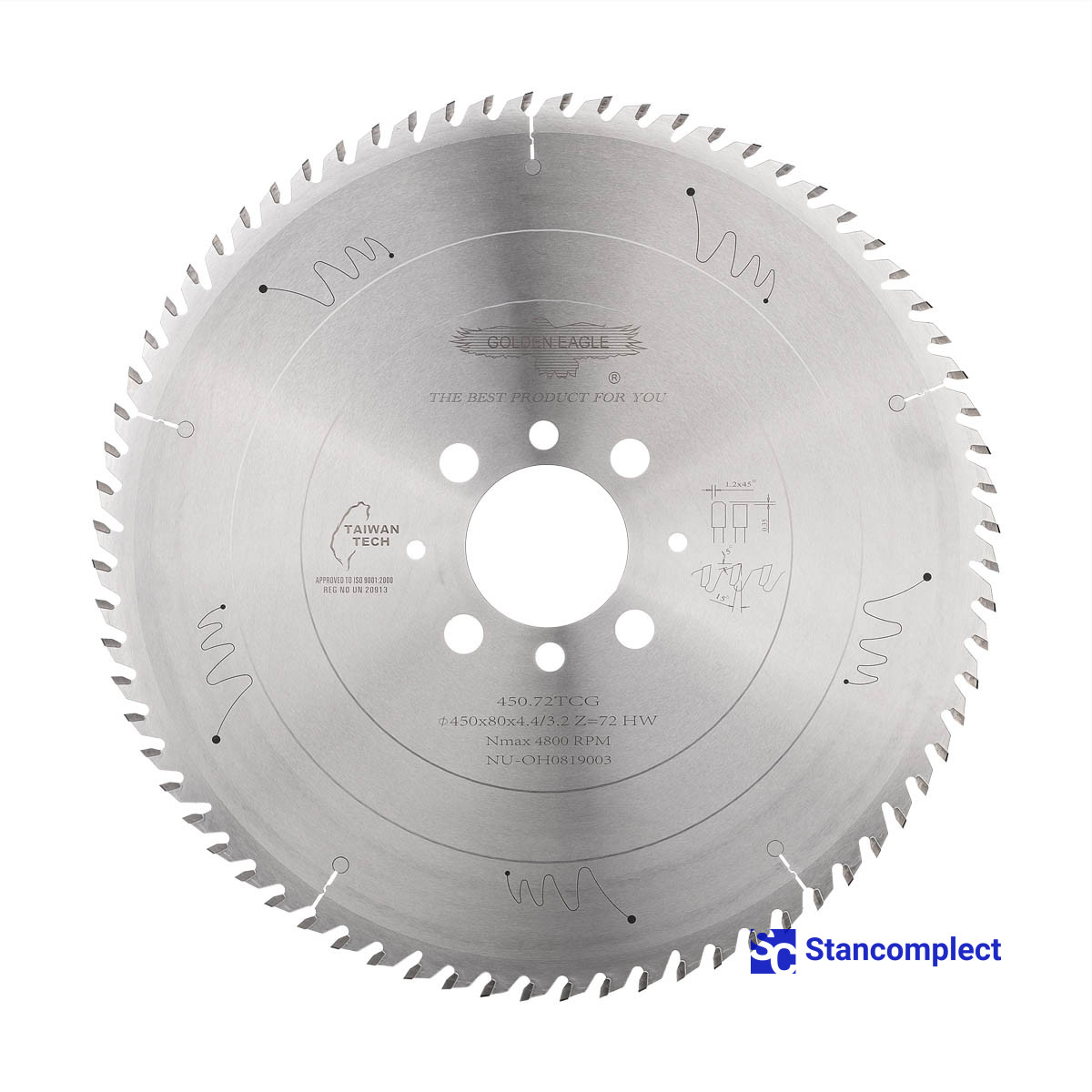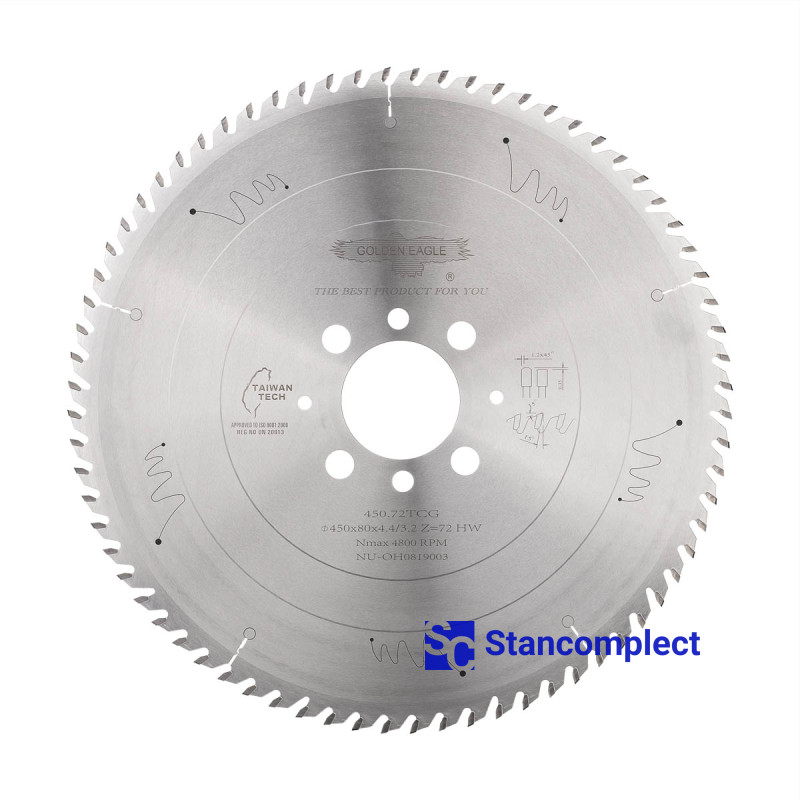 Carbide main saw blade 450x4.4/3.2x80 Z72 for CNC beam saws SCM manufactured by Taiwanese company GOLDEN EAGLE with carbide tips are designed for fine cutting chipboard, laminated chipboard, MDF, HDF, etc.. These saw blades have proven themselves in many furniture enterprises as a high-quality cutting tool.