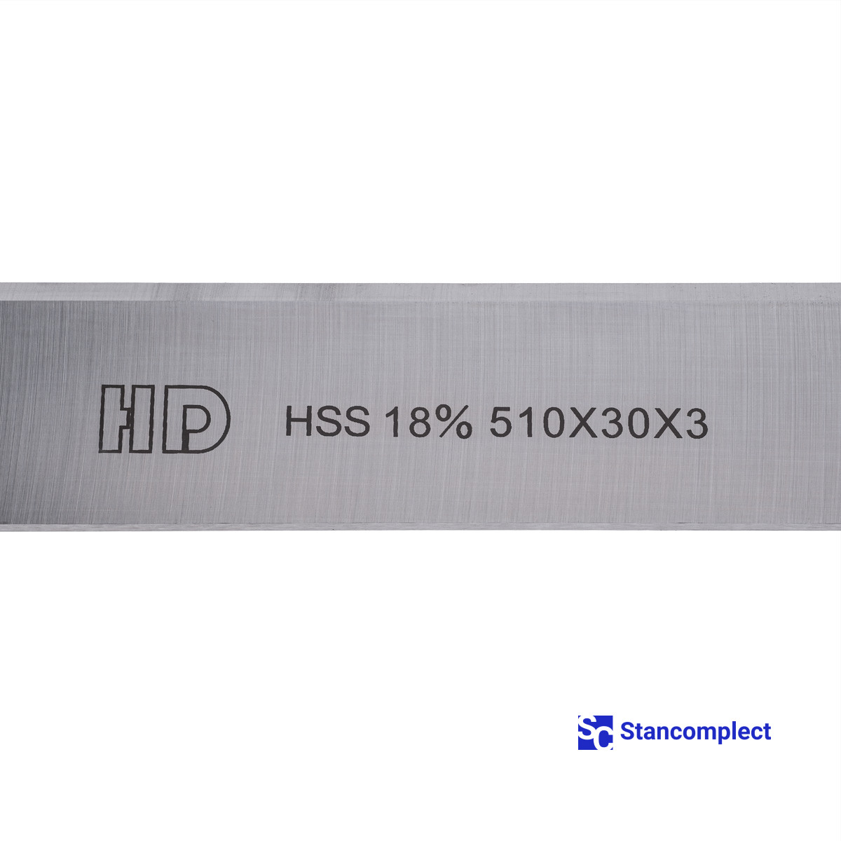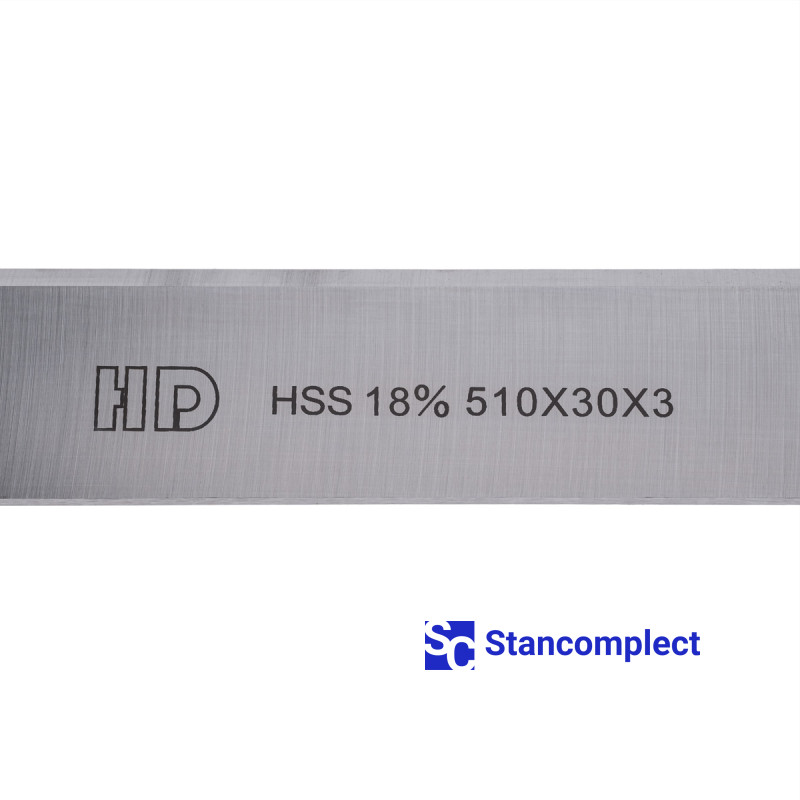 Planer knife 510x30x3 HSS 18% one-sided from HD Woodworking Tools (Taiwan) for knife drums or knife shafts of milling, planing, planing, planer machines. The knife is made of high-quality high-speed steel HSS 18% and is used for straight-line processing of soft and hard woods.