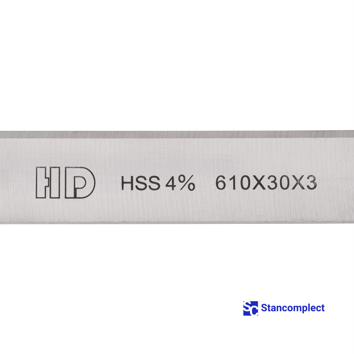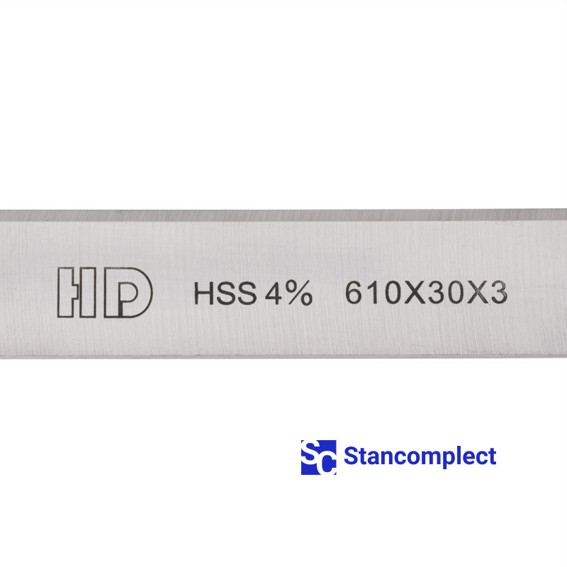 Planer knife 610x30x3 HSS 4% one-sided from HD Woodworking Tools (Taiwan) for knife drums or knife shafts of milling, planing, planing, planer machines. The knife is made of high-quality high-speed steel HSS 4% and is used for straight-line processing of soft and hard woods.