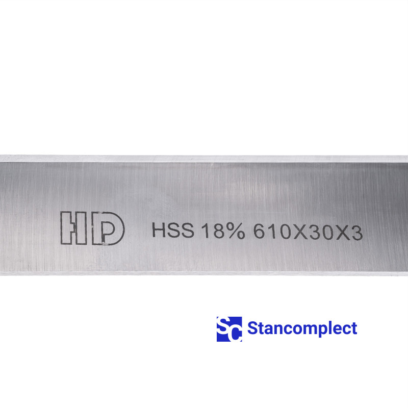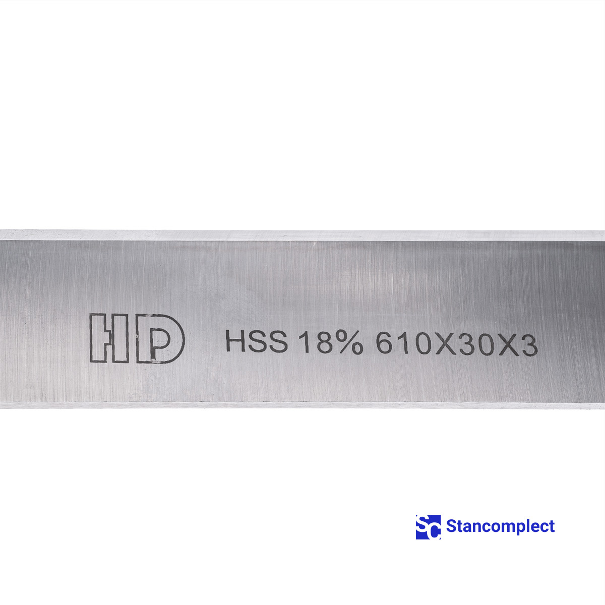 Planer knife 610x30x3 HSS 18% one-sided from HD Woodworking Tools (Taiwan) for knife drums or knife shafts of milling, planing, planing, planer machines. The knife is made of high-quality high-speed steel HSS 18% and is used for straight-line processing of soft and hard woods.