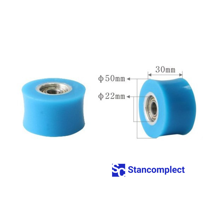 Pressure roller for profile wrapping machine U-507 size 50x30x22 with shaft. The rollers are used on machines for laminating (wrapping) profiles made of MDF, solid wood, chipboard, plastic, aluminum, etc. with rolled finishing materials, such as decorative paper, veneer.