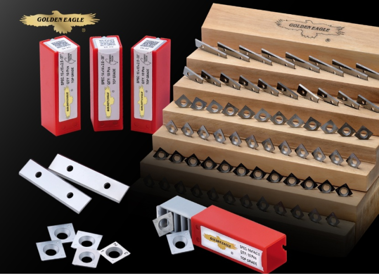 The Stancomplect company presents GOLDEN EAGLE carbide replaceable knives for use on tools ( shell and end mills ) as a replaceable cutting part when processing uncoated / coated chipboard and wood fiber materials (chipboard, chipboard, MDF, HDF, etc.), as well as solid wood.