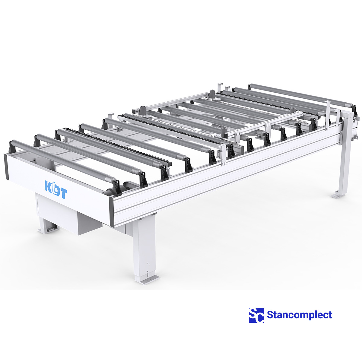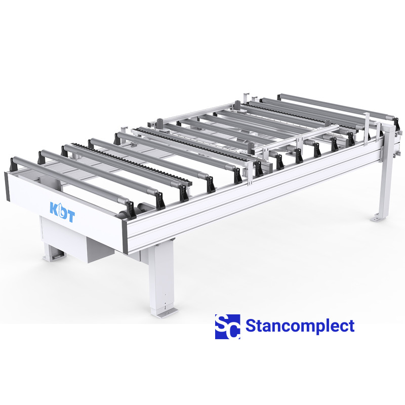 Automatic roller conveyor KDT KHC-333M for integration into an automatic line and performs the function of transporting workpieces. The conveyor has a high-strength 240x50 mm aluminum profile and a double-row roller structure with wear-resistant rubber rollers.
