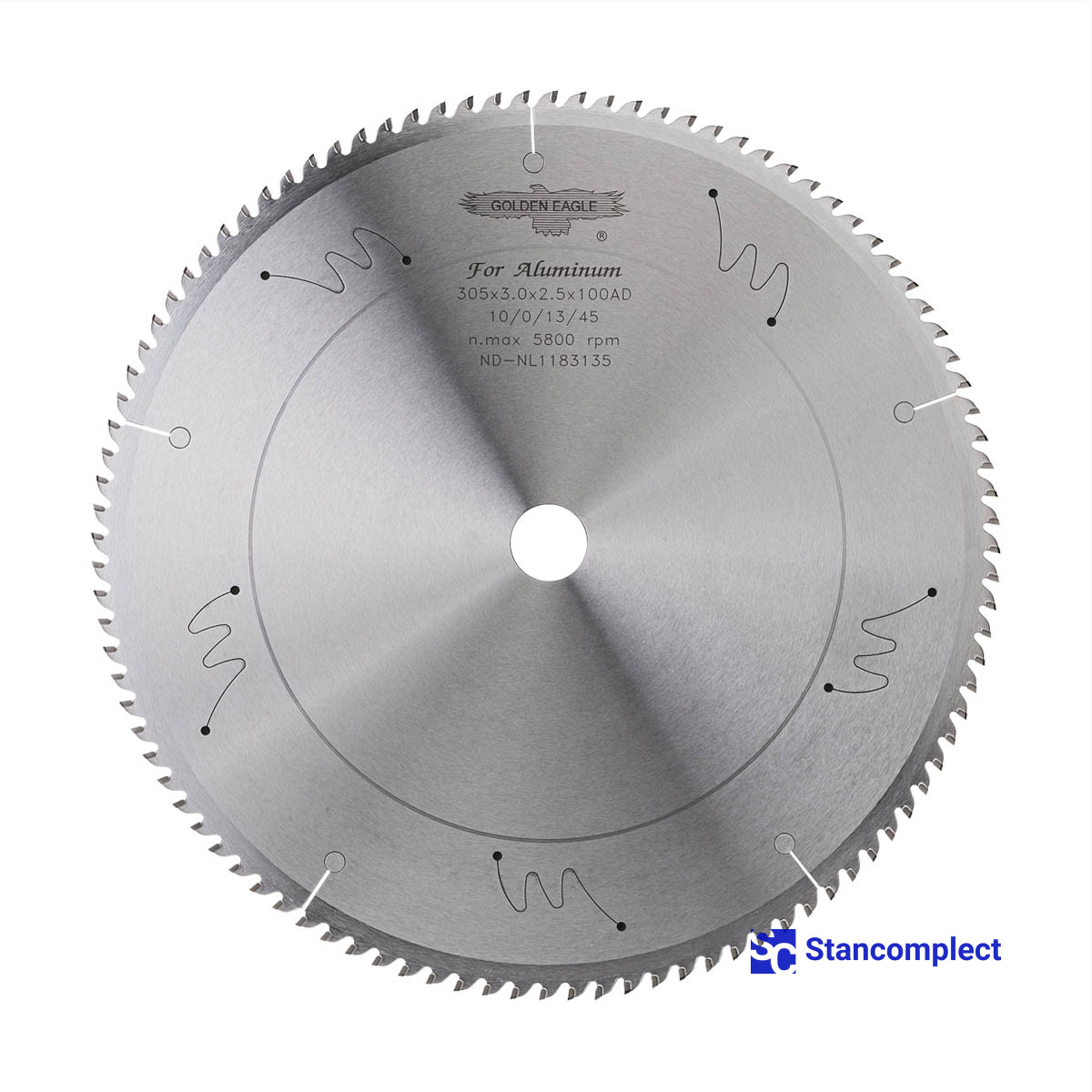 Saw blade 305x25.4x3.0x2.5 Z100AD manufactured by the Taiwanese company GOLDEN EAGLE is designed for cutting aluminum and non-ferrous metals on assembly (cut-off) saws MAKITA LC-1230 and others.