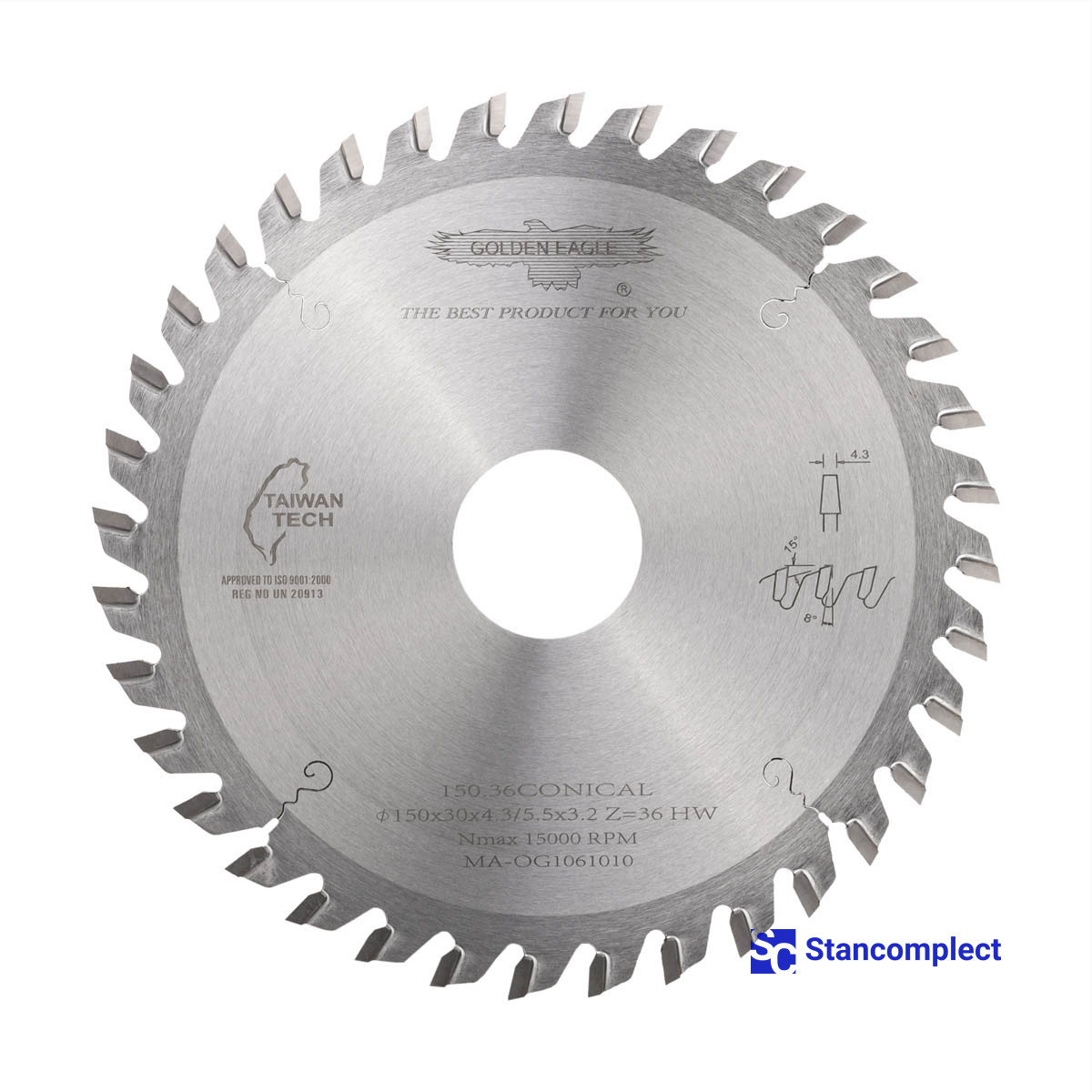 Carbide conical scoring saw blade 150x30x4.3/5.5x3.2 Z36 for CNC beam saws SCM and FELDER manufactured by Taiwanese company GOLDEN EAGLE with carbide tips are designed for fine cutting chipboard, laminated chipboard, MDF, HDF, etc.. These saw blades have proven themselves in many furniture enterprises as a high-quality cutting tool.