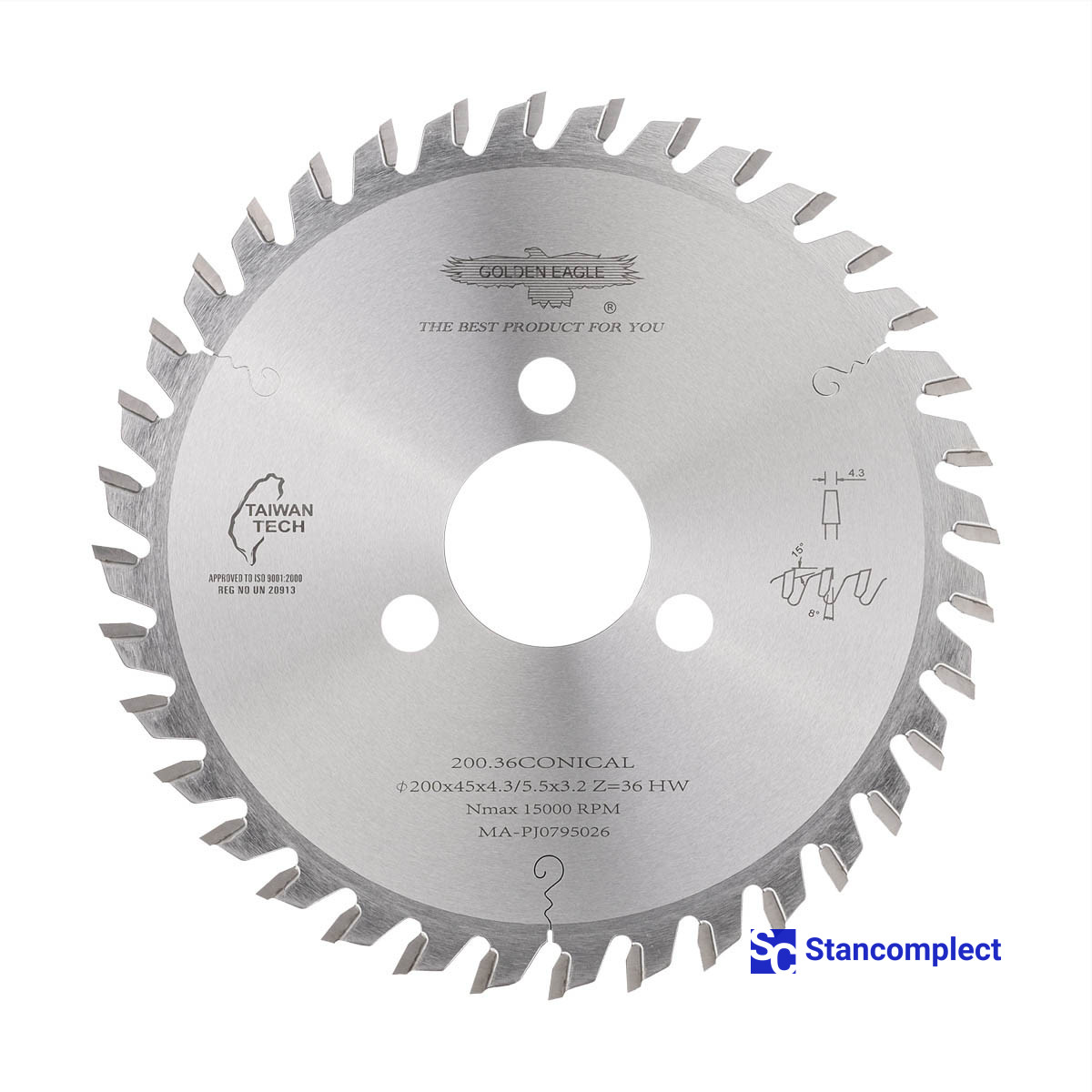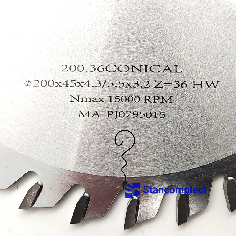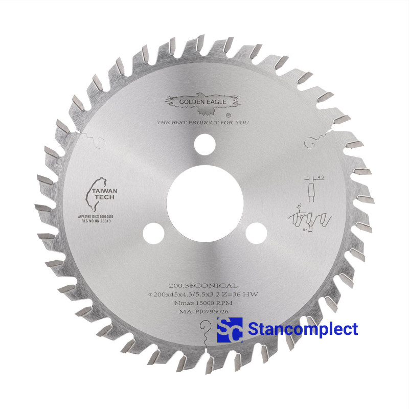 Carbide conical scoring saw blade 200x45x4.3/5.5x3.2 Z36 for CNC beam saws HOLZMA manufactured by Taiwanese company GOLDEN EAGLE with carbide tips are designed for fine cutting chipboard, laminated chipboard, MDF, HDF, etc.. These saw blades have proven themselves in many furniture enterprises as a high-quality cutting tool.