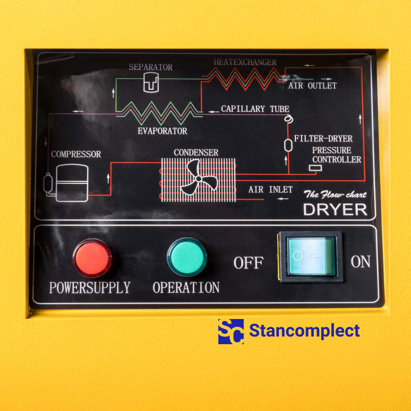 AirHorse AHB-15A-300 oil-filled belt-driven screw compressor (capacity 1,3 m³/min, pressure 10 bar) with 300 l receiver and refrigeration dryer excels in continuous operation in the toughest operating conditions. This compressor station significantly saves space, because both the compressor and the dryer are installed on a horizontal receiver. The compressors are equipped with a microprocessor control panel and are equipped with a preliminary filtration unit . The compressor housing is made using soundproofing material .
