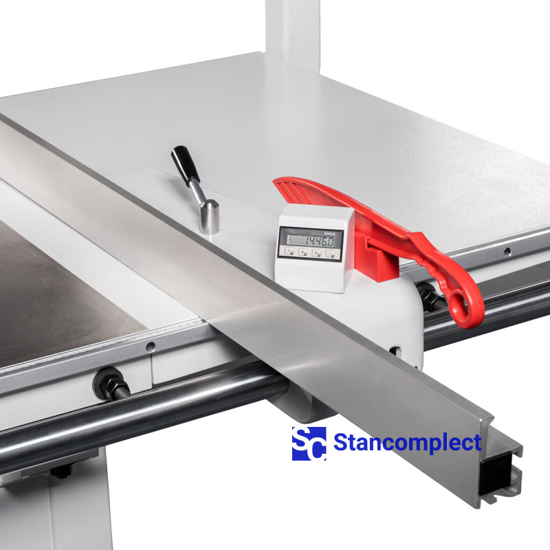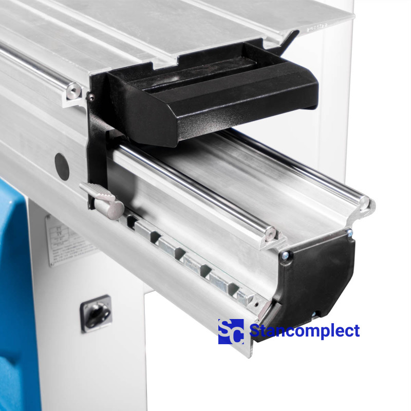 Longitudinal stop with electronic digital display allows you to quickly and accurately set the desired value. Pusher for safe work with narrow workpieces.