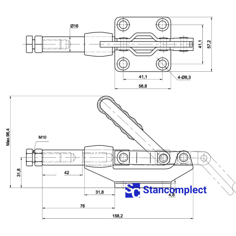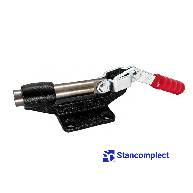 Horizontal push pull toggle clamp ST-304-E with straight stroke for fast clamping of the workpiece. The base of the clamp is made of malleable cast iron. The clamp is fixed in both extreme positions: when the stem is fully extended and when the stem is fully retracted. Thus, the plunger clamp can be used as a tension or clamping device for pressing the part against a stop or against a vertical surface.