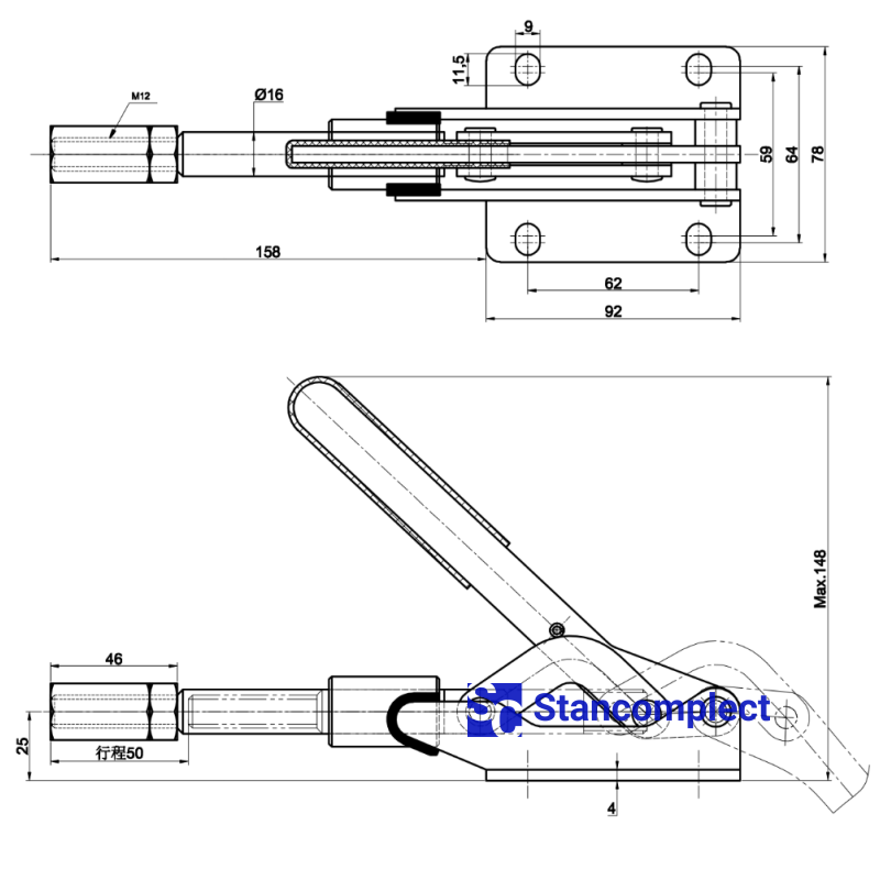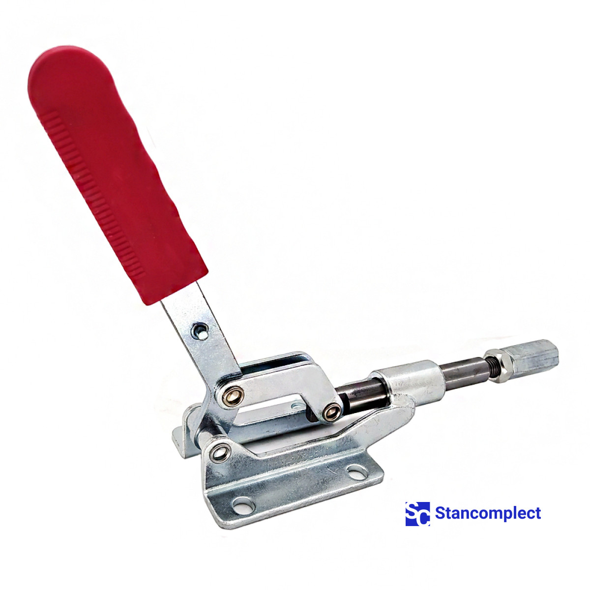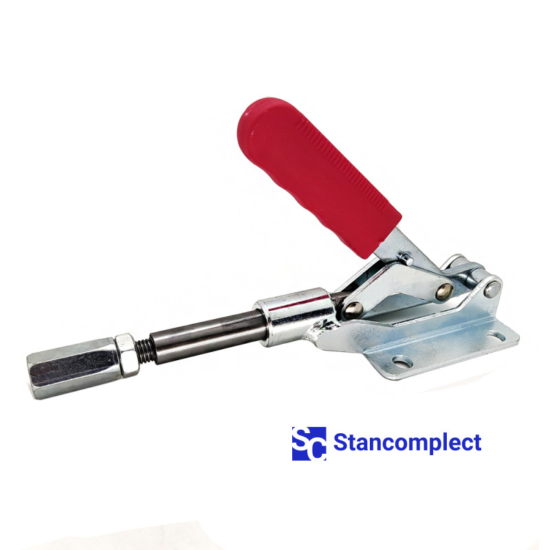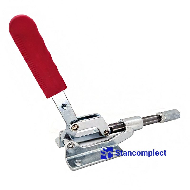 Horizontal push pull toggle clamp ST-303-EM with straight stroke for fast clamping of the workpiece. The clamp is fixed in both extreme positions: when the stem is fully extended and when the stem is fully retracted. Thus, the plunger clamp can be used as a tension or clamping device for pressing the part against a stop or against a vertical surface.