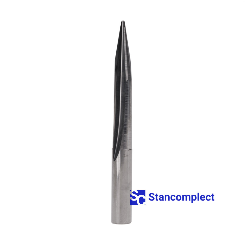 Cone cutter with straight blade for CNC machines for wood 6x60 mm, R0.75x20°. Traditional milling cutters for processing 3D relief with various details, after preliminary roughing of the workpiece. Small depth engravings can be used. Not suitable for contouring. Works well with soft and hard woods.