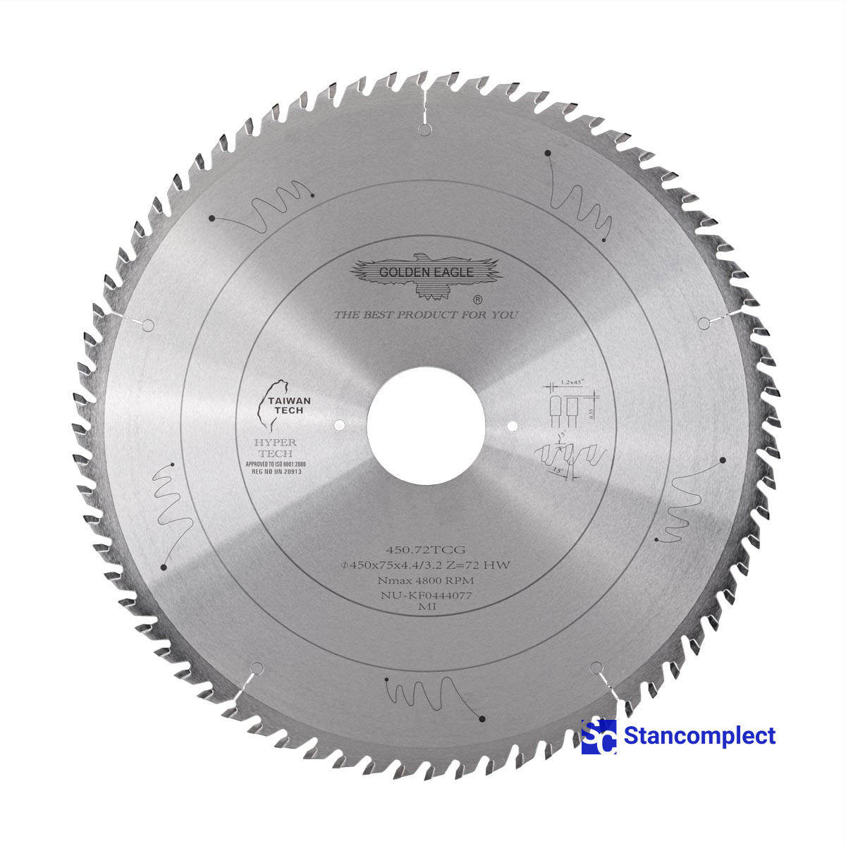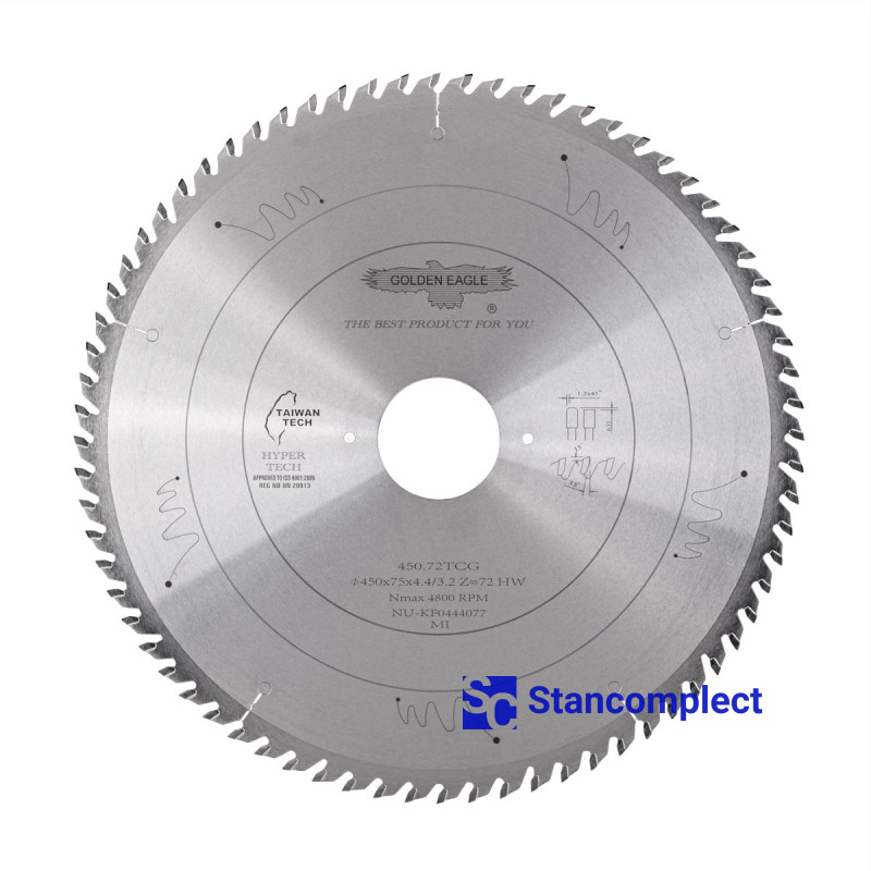 Пила основна твердосплавна 450х75x4.4/3.2 Z72 Mirror Grinding для пильних центрів з ЧПК KDT виробництва Тайванської компанії GOLDEN EAGLE з твердосплавними напайками призначена для чистового розкрою ДСП, ЛДСП, МДФ, ХДФ та ін.. Ці пили добре зарекомендували себе на багатьох меблевих підприємствах, як якісний ріжучий інструмент.