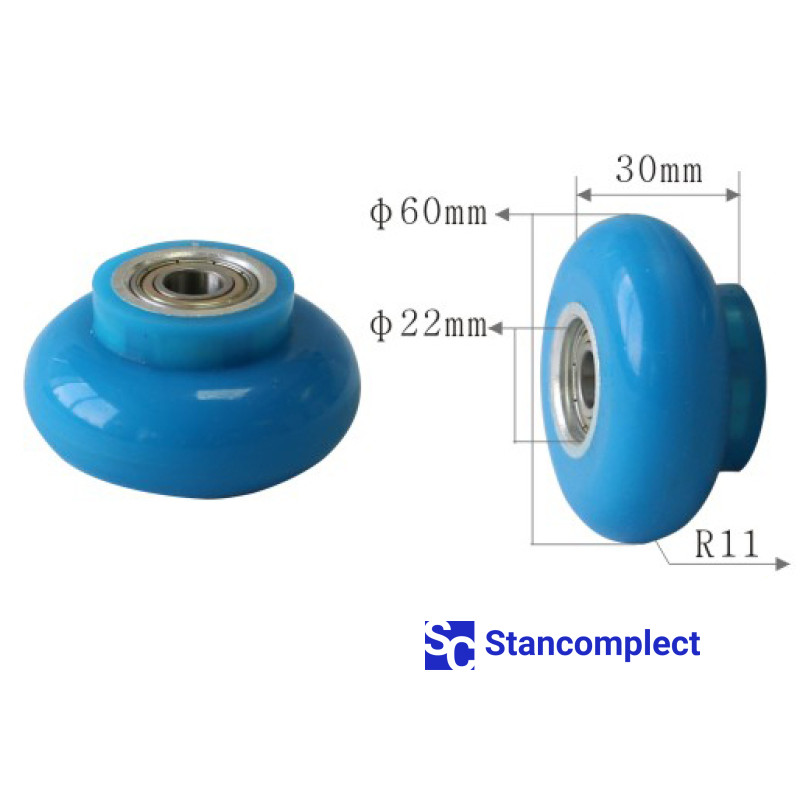Ролик притискний U-512 розміром 60х30х22хR11 зі штифтом верстата для ламінації. Ролики використовуються на верстатах з ламінації (окутування) профілів з МДФ, масивної деревини, ДСП, пластику, алюмінію тощо рулонними оздоблювальними матеріалами, такими як, декоративний папір, шпон.