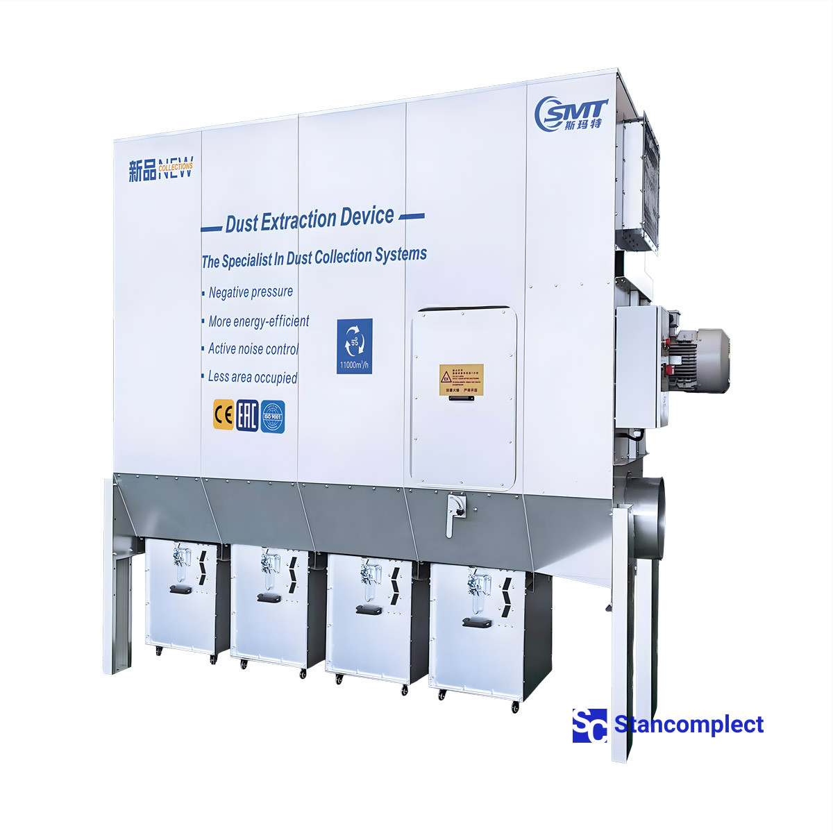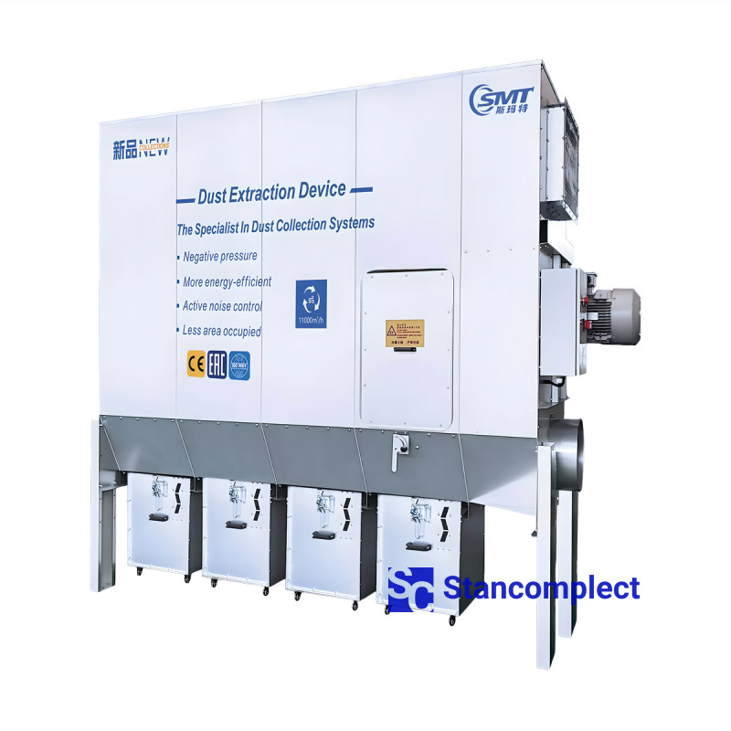 Вентилятор располагается на стороне чистого воздуха, что исключает прохождение отфильтрованного материала через крыльчатку. Это позволяет снизить уровень шума и полностью исключить риск образования искр, что делает производство безопаснее.