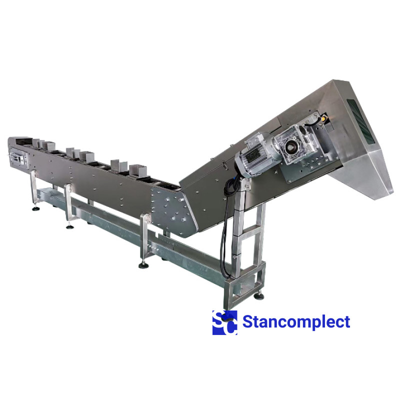 Подсчитанная фурнитура из вибробункеров попадает на транспортер, ковши внутри окрашены шумопоглощающей краской. Транспортер имеет предварительную установку на 16 вибробункеров. Каждая линия комплектуется под индивидуальные задачи предприятия, благодаря этому легко перестраивается с одного типа фасующейся продукции на другой. Свободные места для вибробункеров могут быть укомплектованы необходимыми вибробункерами при возникновении такой необходимости.