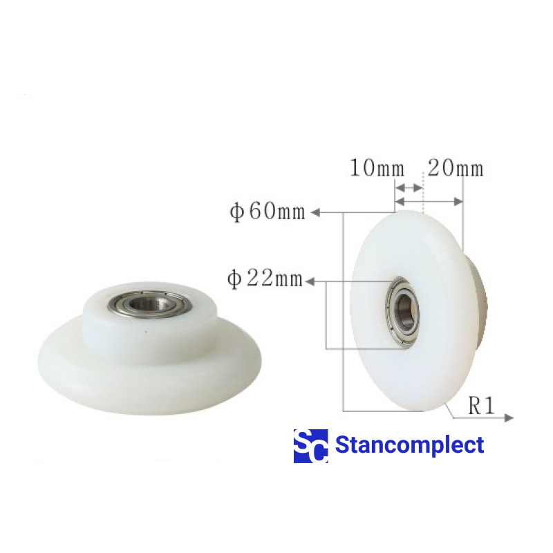 Ролик пластиковый окутывающего станка U-530 60x22x10х20xR1 со штифтом. Ролики используются на станках по ламинации (окутыванию) профилей из МДФ, массивной древесины, ДСП, пластика, алюминия и т. п. рулонными отделочными материалами, такими как, декоративная бумага, шпон.