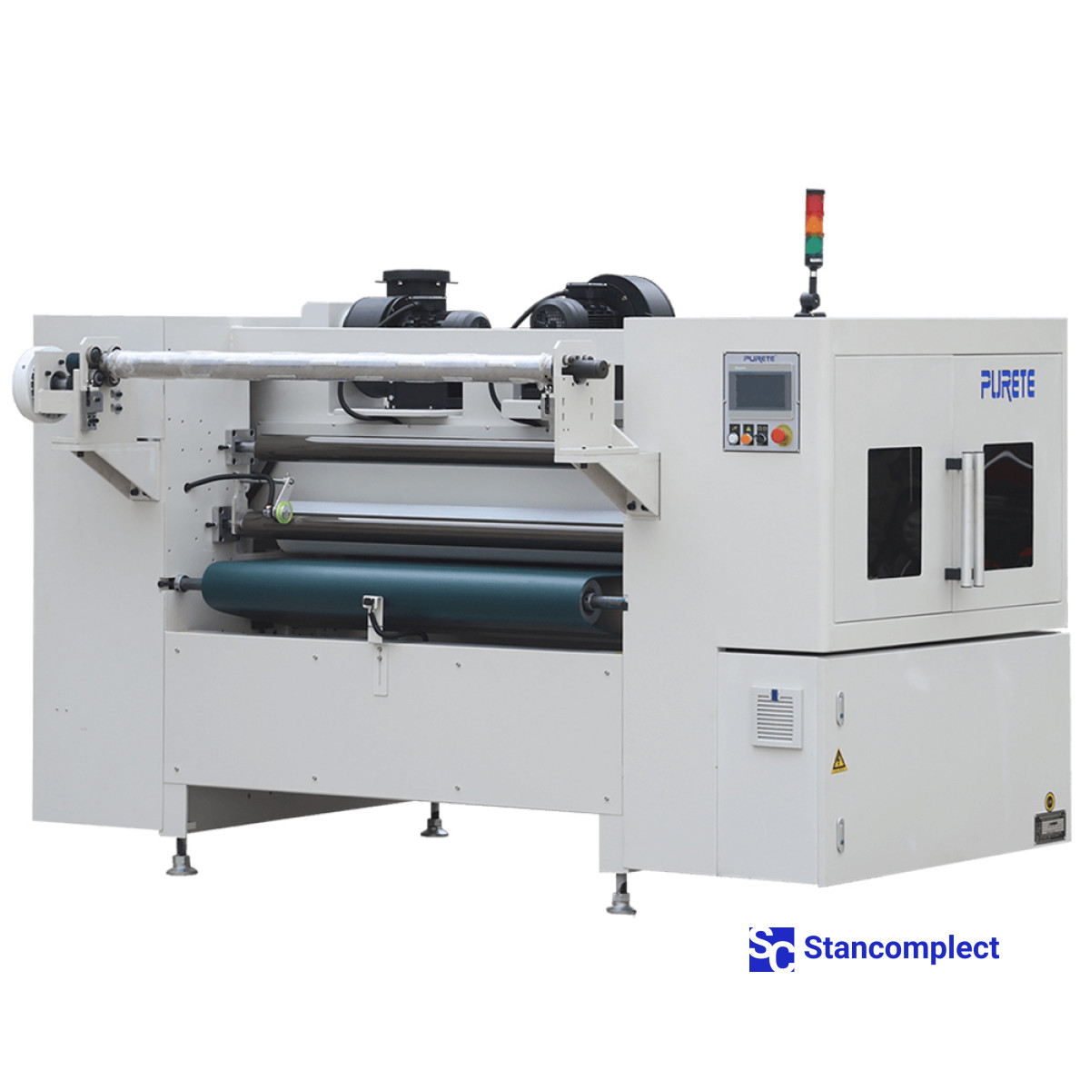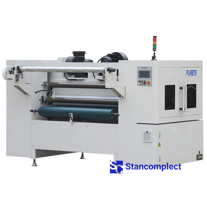 Верстат для текстурування плівки (inert coating) PURETE MY1113D призначений для надання мокрим шарам нанесеного ЛФП різних текстур за допомогою відбитку рельєфу прозорої плівки. Можливі ефекти глянцю, софт-тач та створення інших текстурних поверхонь. Спеціальна текстуруюча ПЕТ плівка притискається до ще мокрого шару ЛФП через вали, і УФ лампами шар підсушується, таким чином текстура передається з плівки на фарбу.